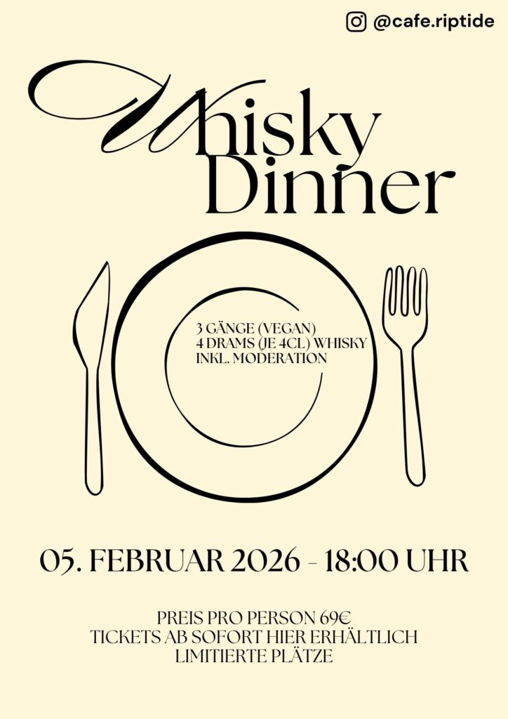 Hey Leute! Wir haben etwas Neues: Am 5. Februar 2026 veranstalten wir zum allerersten Mal ein Whisky Dinner im Riptide.